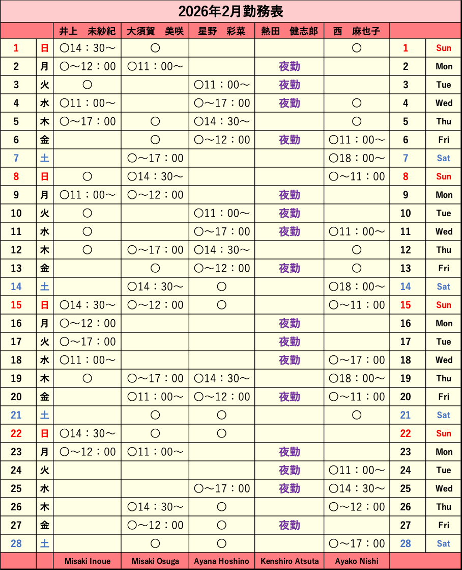 2月の獣医師シフト表 2026.02.19 獣医師の2月のシフトをお知らせいたします。 ※シフトは予告なく変更される場合がございます。何卒ご了承ください。 ご不明な点がございましたら、お気軽にお問い合わせください。 Post Share Hatena Pocket RSS feedly Pin it 年末年始の診察等に関してのご案内 前の記事