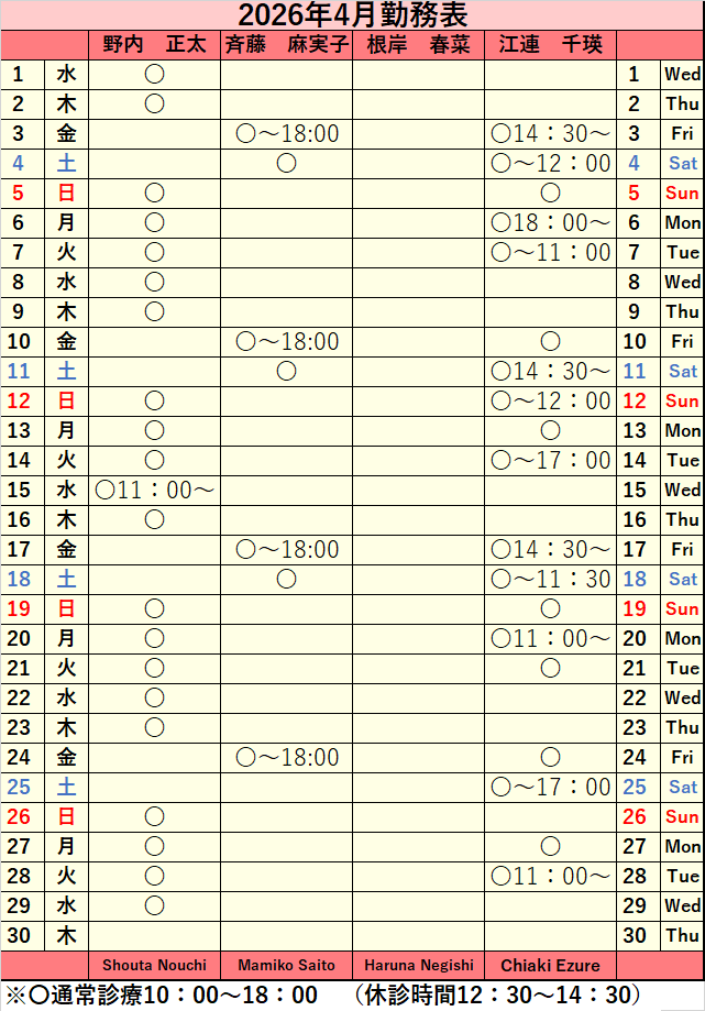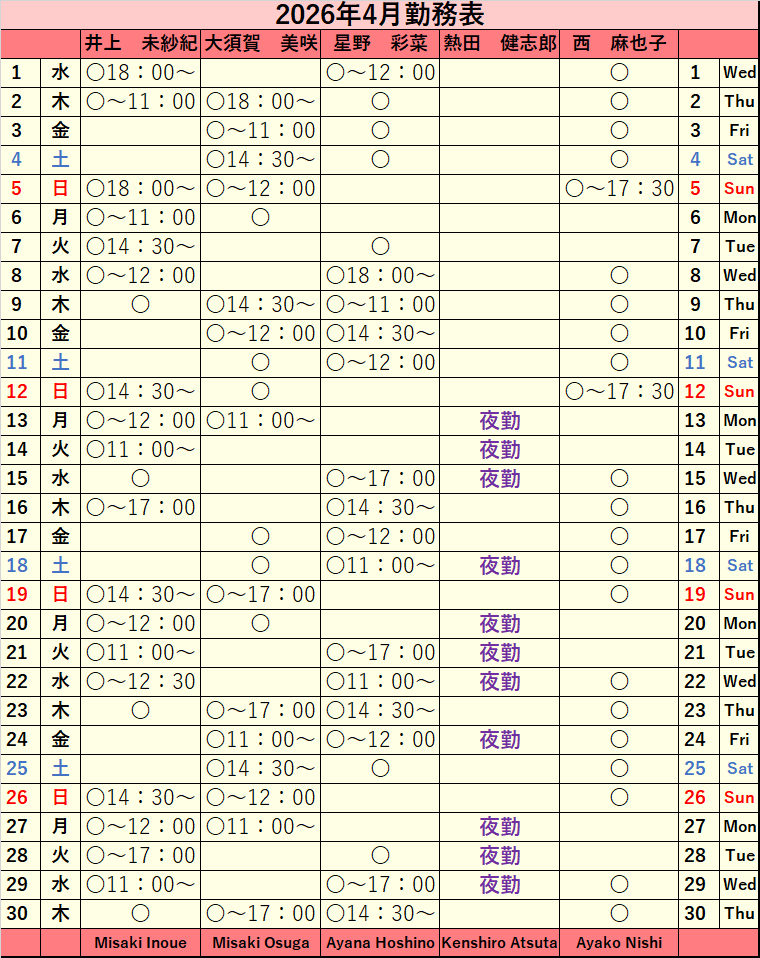 2026年4月シフト表