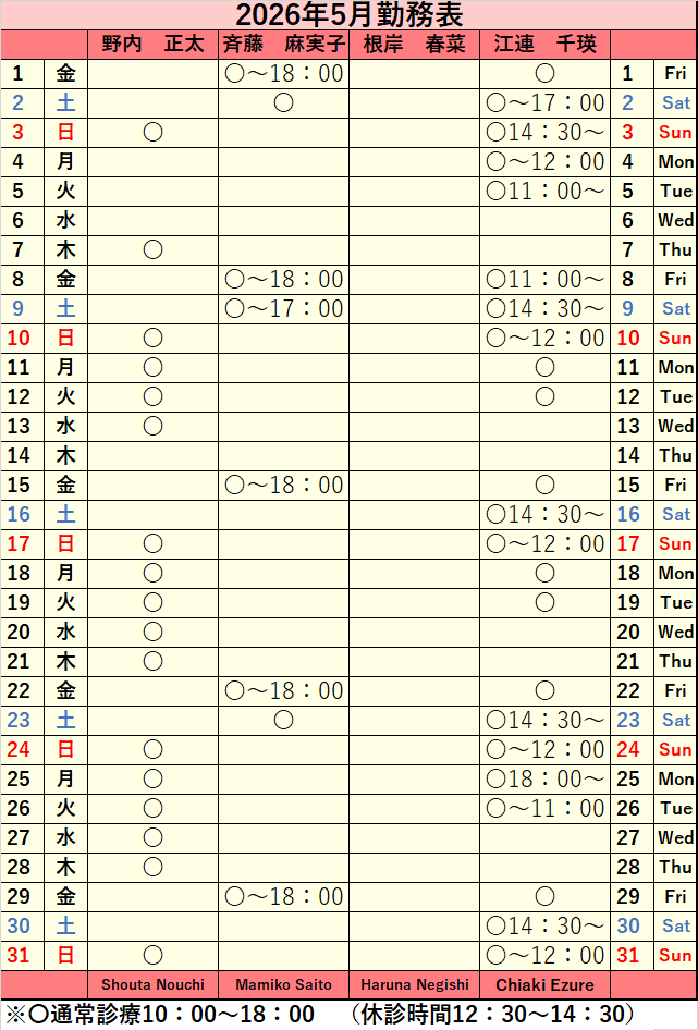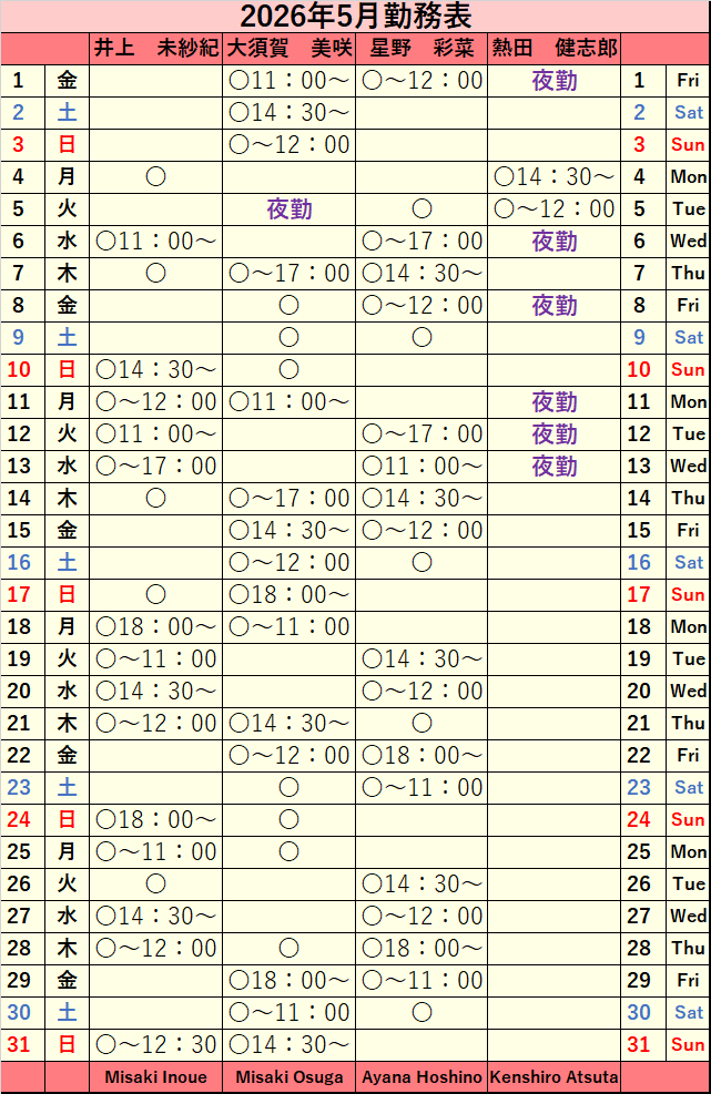 ※シフトは予告なく変更される場合がございます。何卒ご了承ください。