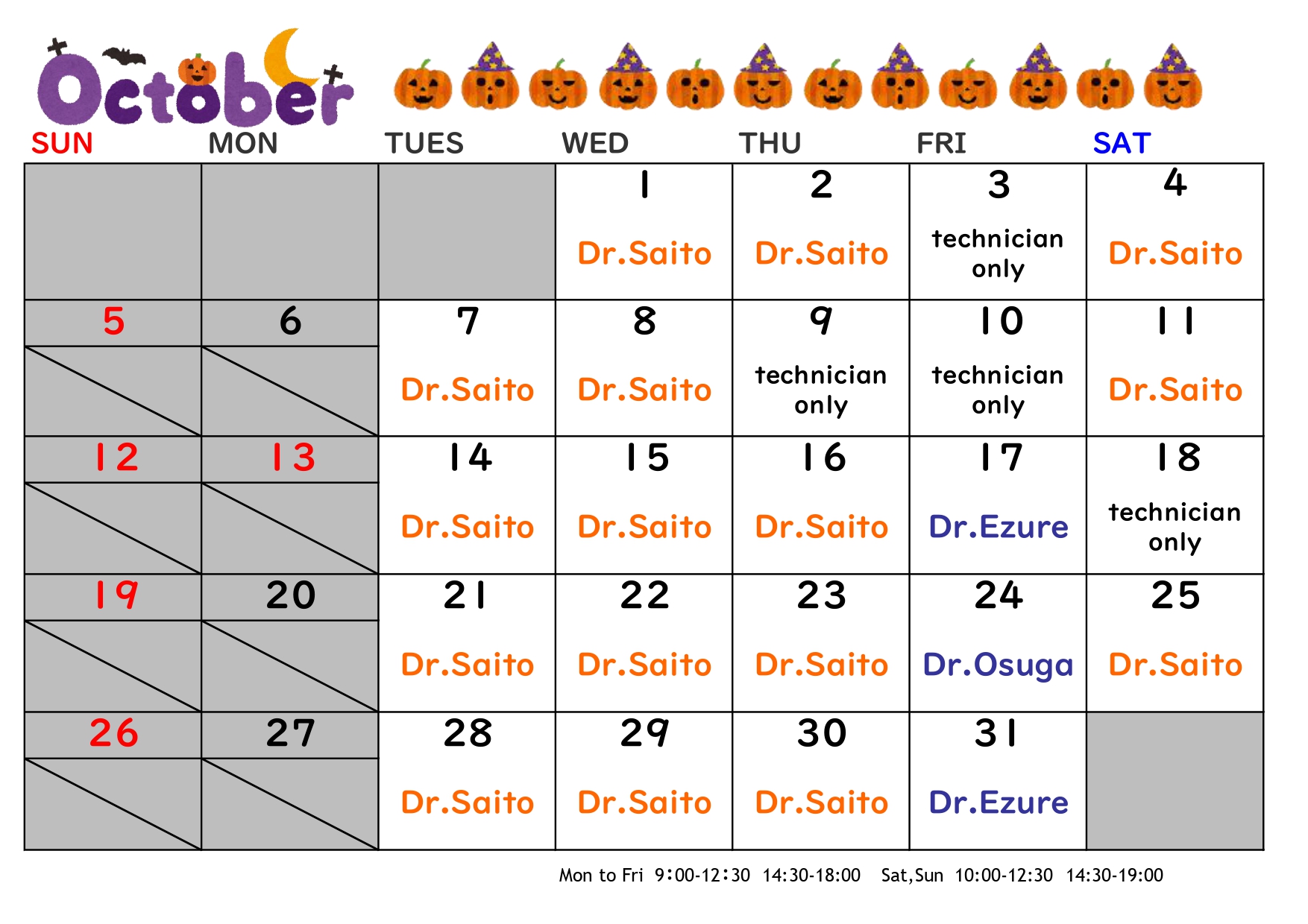 10月の診療日のご案内 2025.09.29 3日、9日、10日と18日が臨時休診となります。 [October] Our clinic will be temporarily closed on 3th, 9th, 10th and 18th. Post Share Hatena Pocket RSS feedly Pin it 9月の診療日のご案内 前の記事